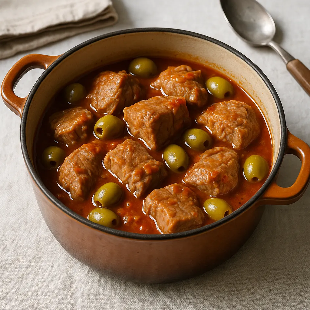 Les olives s’ajoutent dans la dernière demi-heure. Elles gardent ainsi un goût plus net, et la sauce reste mieux équilibrée. En fin de cuisson, si elle paraît trop fluide, laissez quelques minutes à découvert. Si elle a trop réduit, ajoutez un petit trait d’eau.
